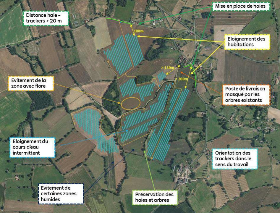 Le choix du modèle de panneaux, le type de structure les accueillant ainsi que le design de la centrale solaire résultent de la prise en compte des différents enjeux locaux étudiés : sensibilités environnementale, paysagère et surtout la concordance avec le projet agricole.